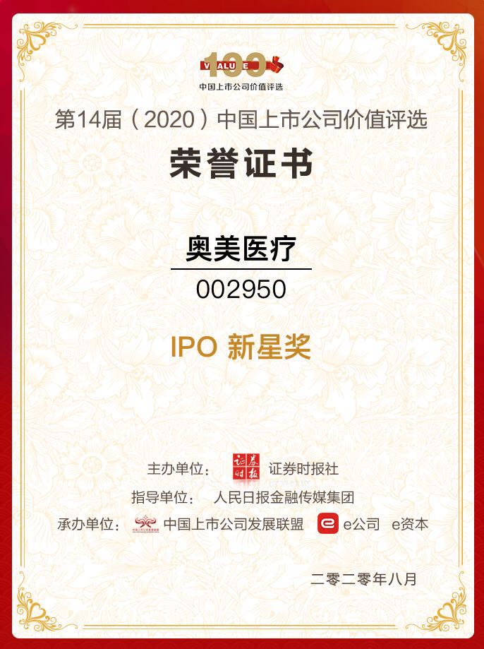 近日,由人民日报金融传媒集团指导、证券时报社主办的“第14届中国上市公司价值评选”榜单正式揭晓,钛信资本所投项目奥美医疗(002950)荣获“中国上市公司IPO新星奖”。随着A股核心资产崛起,价值投资重新引领风潮,奥美医疗作为价值投资的标杆,载誉而行。钛信资本用时间再度证明,选择头部优秀企业进行价值投资的正确性。
